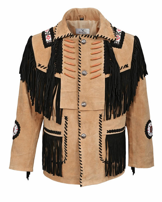Men Native American Western Cowboy Suede Leather Jacket Fringe Bones Beaded Coat