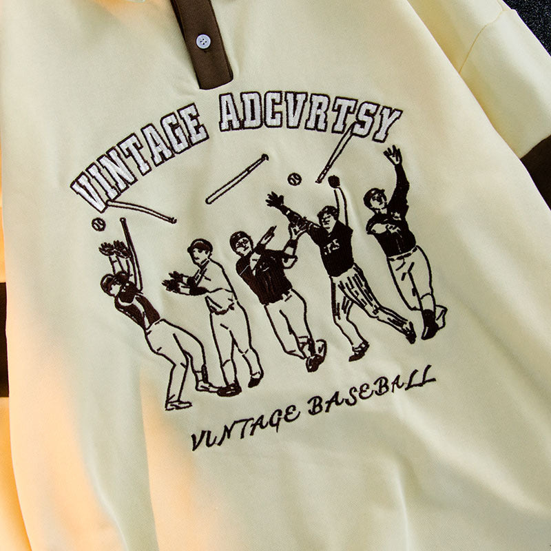 Fashion Loose Embroidered Colorblock Polo Neck Sweatshirt
